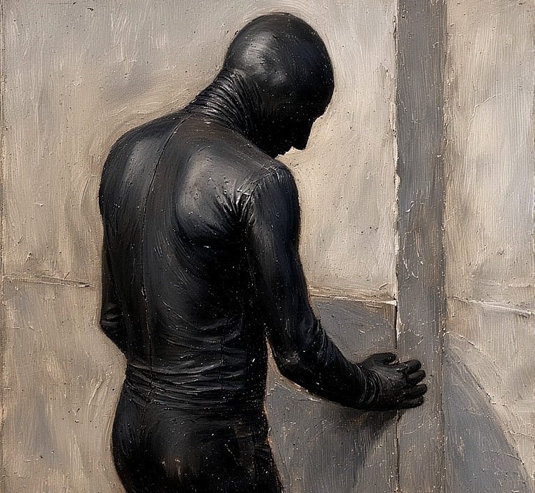 A heist enclosing a heist. He dressed carefully to pull off the job. He’d decided on skintight black elasticated one-piece, black climbing shoes with separate toes for a simian agility, and fine black satin-lycra gloves with special fingertip pads for extra sensitivity. He donned all these garments with great care in order to pull off this high-stakes job. He flexed himself and found movements perfectly supple in skintight elasticated lycra smooth with extra padding at the crotch, and then he tugged on the skimask in fine black satiny fabric that he’d chosen to conceal himself with, but would soon discard.